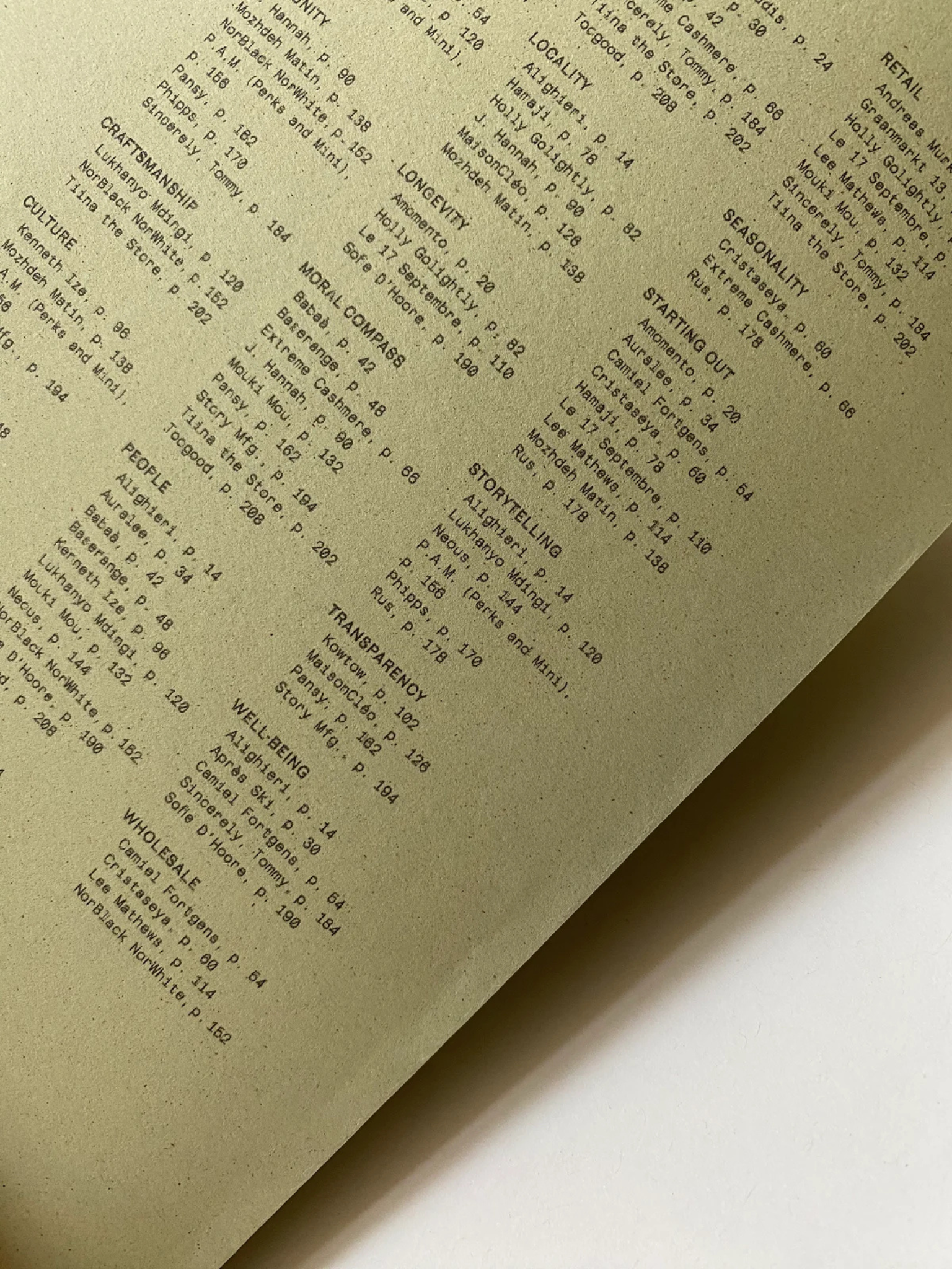 Through 33 conversations with leading brand and boutique owners, the book reveals how companies like Amomento, Auralee, Baserange, Cristaseya, Extreme Cashmere, J. Hannah, Lee Mathews, and more are redefining what it means to build in the Anthropocene: the age of human-induced climate breakdown. Each dialogue shares candid philosophies and curated solutions for stepping beyond a broken system into new measures of success rooted in care, instinct, locality, and regeneration.